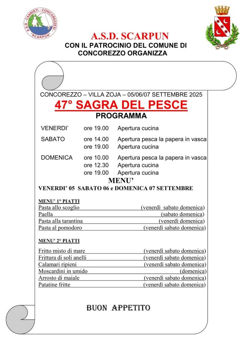 Puntuale come da tradizione, anche nel 2025 vi aspettiamo a Villa Zoja per la 47ª edizione della nostra strepitosa Sagra del Pesce. Un appuntamento imperdibile per gustare le nostre specialità e vivere insieme momenti indimenticabili. Non mancate!